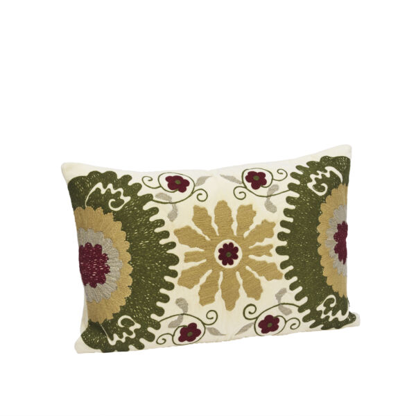 Dieser Kissenbezug spiegelt die zeitlose Kunst des Suzani wider, die ihren Ursprung in Indien hat. Er ist aus luxuriösem Baumwollsamt gefertigt und mit aufwendigen Stickereien verziert, die von klassischen persischen Motiven inspiriert sind. Erhältlich in den Farben Off-White, Grün, Tapenade, Grau und Rubinrot, wertet dieses Stück mit seiner kunstvollen Textur jeden Raum auf. Die fein detaillierten Stickereien verkörpern die Essenz dieses alten Handwerks und fügen sich nahtlos in traditionelle, moderne und eklektische Innenräume ein.