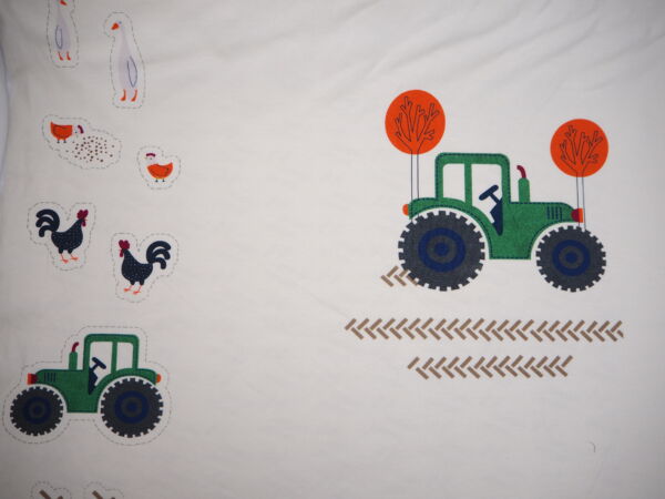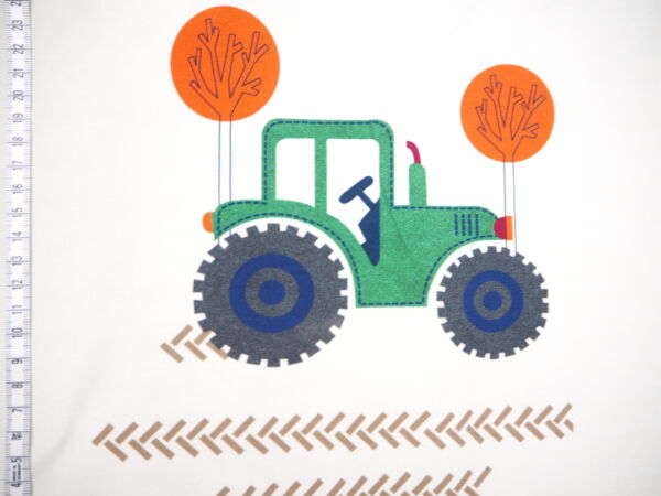 Erkunde den Bauernhof mit einem coolen Traktor. Der Rapportstoff ist mit einem besonders grossen Motiv bedruckt, welches ein absoluter Hingucker auf jedem Pulli, jeder Hose oder anderen Kreationen ist. Vor dem Zuschneiden, richtest du dein Schnittmuster auf dem Stoff so aus, damit das Motiv genau an der gewünschten Stelle liegt.