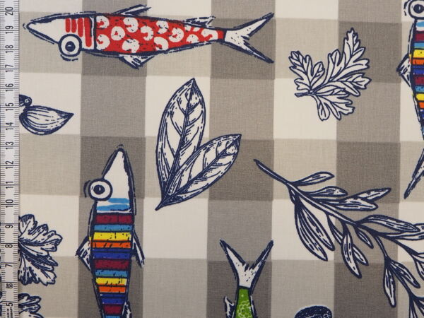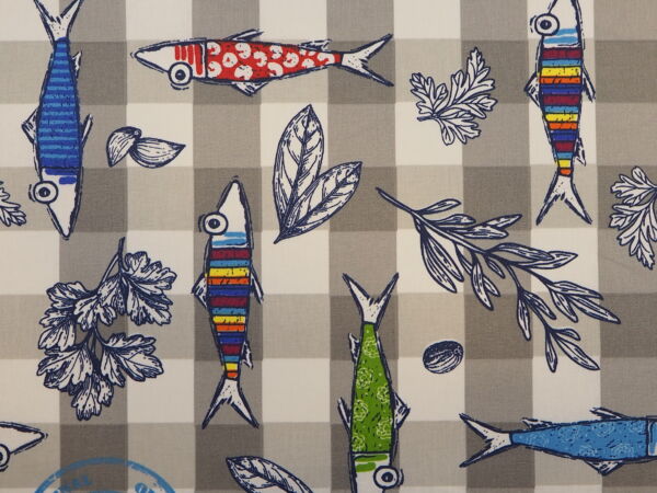 Grau, Blau, Wachstuch mit bunten Fischen auf Karo
