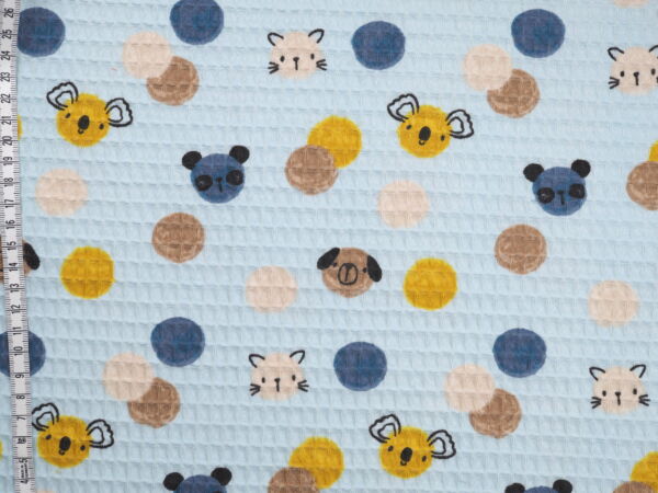 Hellblauer Waffelbaumwollstoff mit bunten Tiergesichtern