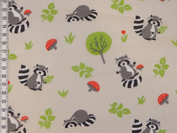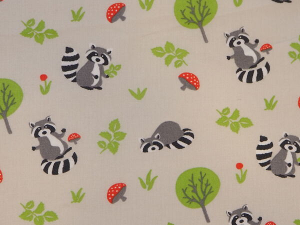 Natur/grau/schwarz/rot Wachstuch mit Waschbären