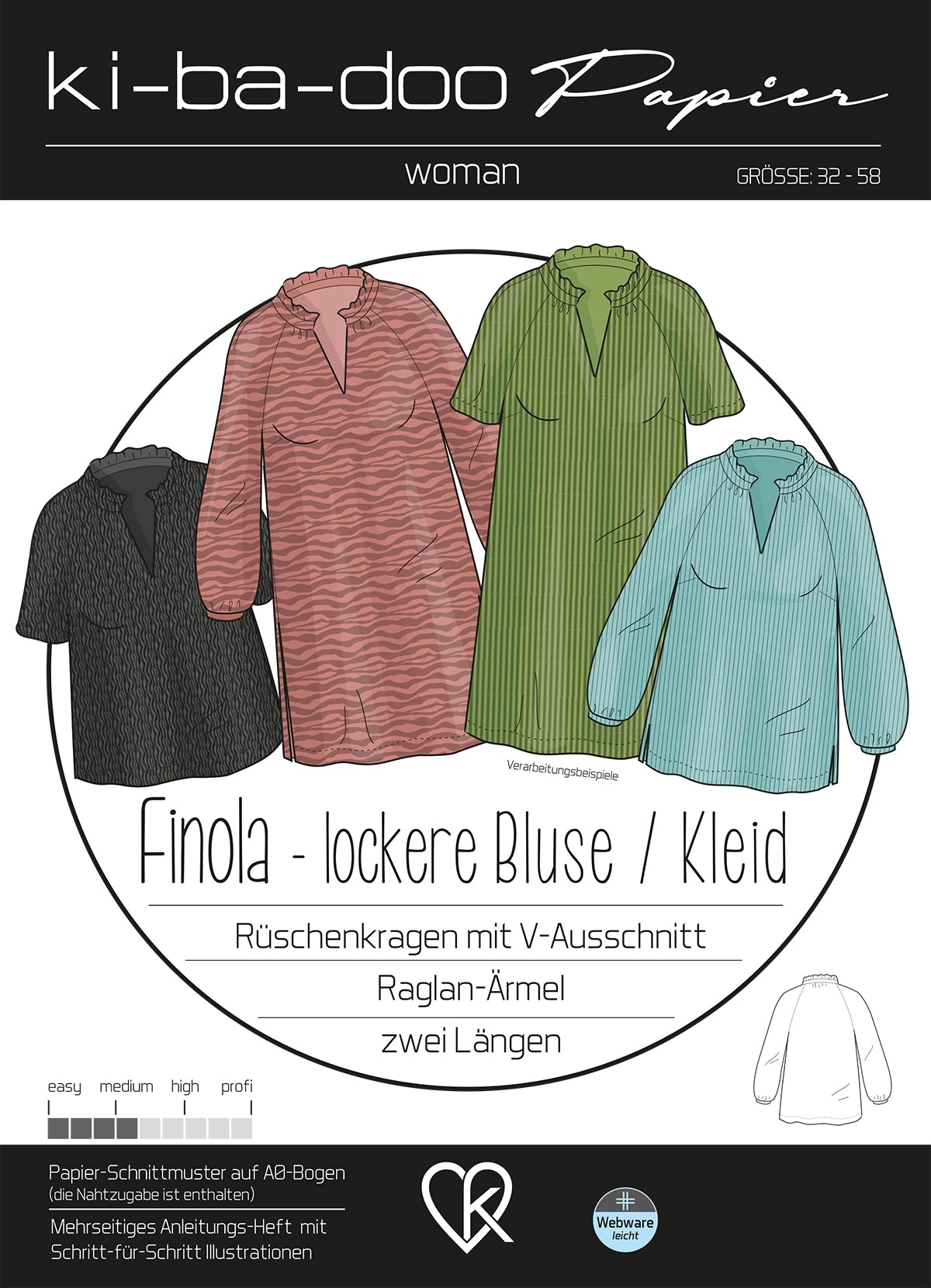 Der Kragen wird nicht verstärkt und schmiegt sich schön an den Hals und das Schlüsselbein an. Die kleinen Kräusel im Vorder- und im Rückenteil sorgen für die lässige Weite der Bluse, die besonders schön mit weich fallenden Stoffen wie Viskose, Seide oder auch Chiffon zur Geltung kommt. Seitliche Schlitze und der Raglan-Ärmel machen den modernen Look der Bluse komplett.urch die zwei im Schnittmuster enthaltenen Längen kann man Finola auch toll als Kleid/Tunika nähen. Bei den Ärmeln hat man die Wahl zwischen kurzen und langen Ärmeln – somit hat das Schnittmuster wieder viele verschiedene Variationsmöglichkeiten und kann das ganze Jahr über zum Einsatz kommen.