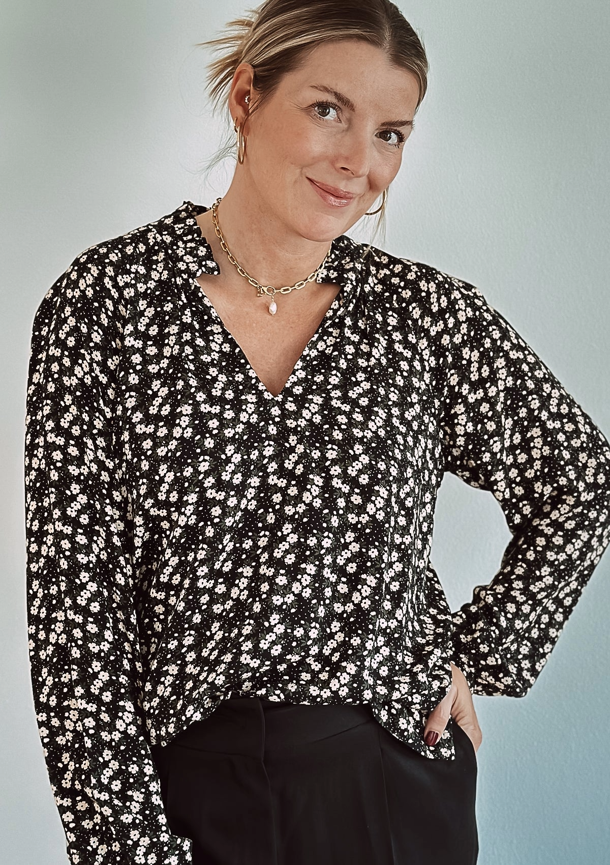 Finola ist eine locker fallende Bluse mit einem romantischen, aber dennoch dezenten Rüschenkragen. Sie hat einen schmalen eleganten V-Ausschnitt, an dem mit einem kleinen Steg der Rüschenkragen angesetzt wird.