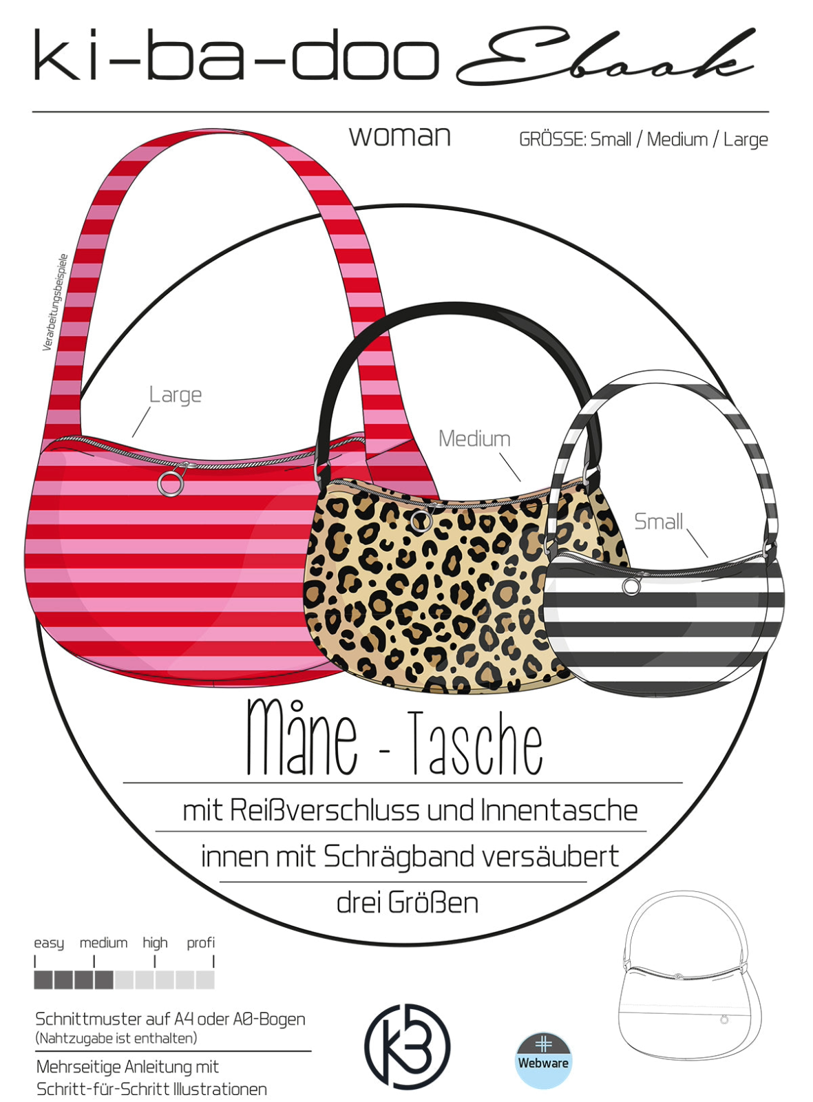 Måne“ – benannt nach dem dänischen Wort für Mond – ist eine stylische Tasche in Halbmondform, die minimalistisches Design mit praktischer Funktion kombiniert. Das Schnittmuster kommt in drei Größen (S, M und L) und lässt sich ganz nach deinem Stil und Anlass nähen: ob als lässige Crossbody-Tasche oder coole Mini-Bag.