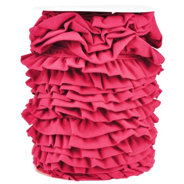 Hergestellt sind unsere hochwertigen Jersey-Bänder aus langstapeligen feinglatten Baumwollgarnen, kurze und grobe Fasern werden in der Produktion ausgesondert. Unsere Jersey-Bänder sind fein gestrickt, hautfreundlich und weich. Bei diesem Band fallen die Rüschen dank der Doppellagigkeit des Stoffes sehr gefällig. Das Band bezaubert jedes Nähobjekt und sorgt für einen luftigen Look, die Haptik ist schön flauschig.