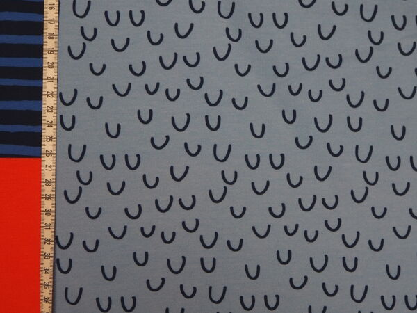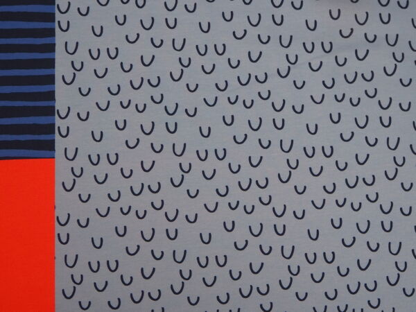 Der Rapportstoff ist mit einem grossen Motiv bedruckt, welches sich wiederholt. Ein Rapport definiert einmal das gesamte Motiv, bevor es sich wiederholt. Bei diesem Stoff ist ein Rapport 100cm lang. Der Stoff ist dehnbar und lässt sich gut waschen. Denk aber bei der Stoffberechnung daran, dass der Stoff bis zu 10% eingehen kann. Daher den Stoff unbedingt vor dem Verarbeiten waschen. Waschmittel ohne Bleiche benutzen, es nimmt dem Stoff sonst die Farbe. Der passende 200m Polyesterfaden von MEZ hat die Farbnummer 1097.