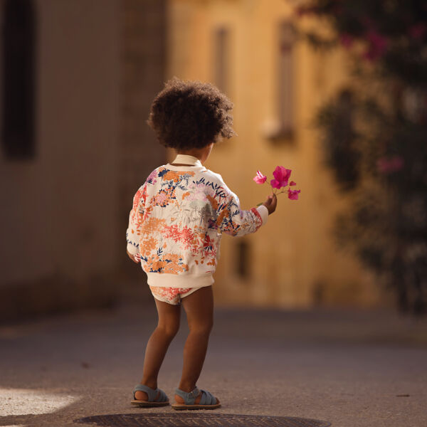 Ein wunderschöner French Terry mit einem sehr ruhigen, blumigen Muster in fröhlichen Farben. Die Blütenbündel sind zwischen 3 und 15 cm groß.